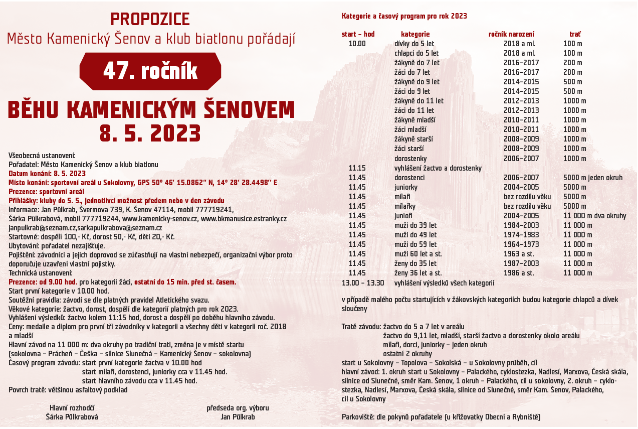 vyhlášení výsledků: žactvo kolem 11:15 hod, dorost a dospělí po doběhu hlavního závodu.