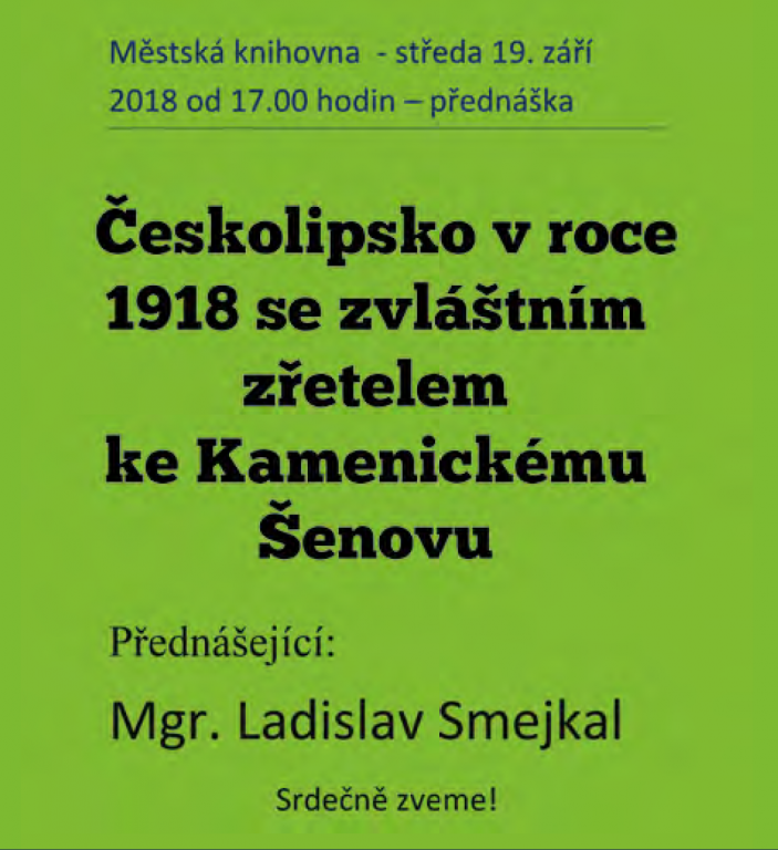 Městská knihovna v Kamenickém Šenově Vás srdečně zve na přednášku Mgr. Ladislava Smejkala - Českolipsko v roce 1918 se zřetelem ke Kamenickému Šenovu.