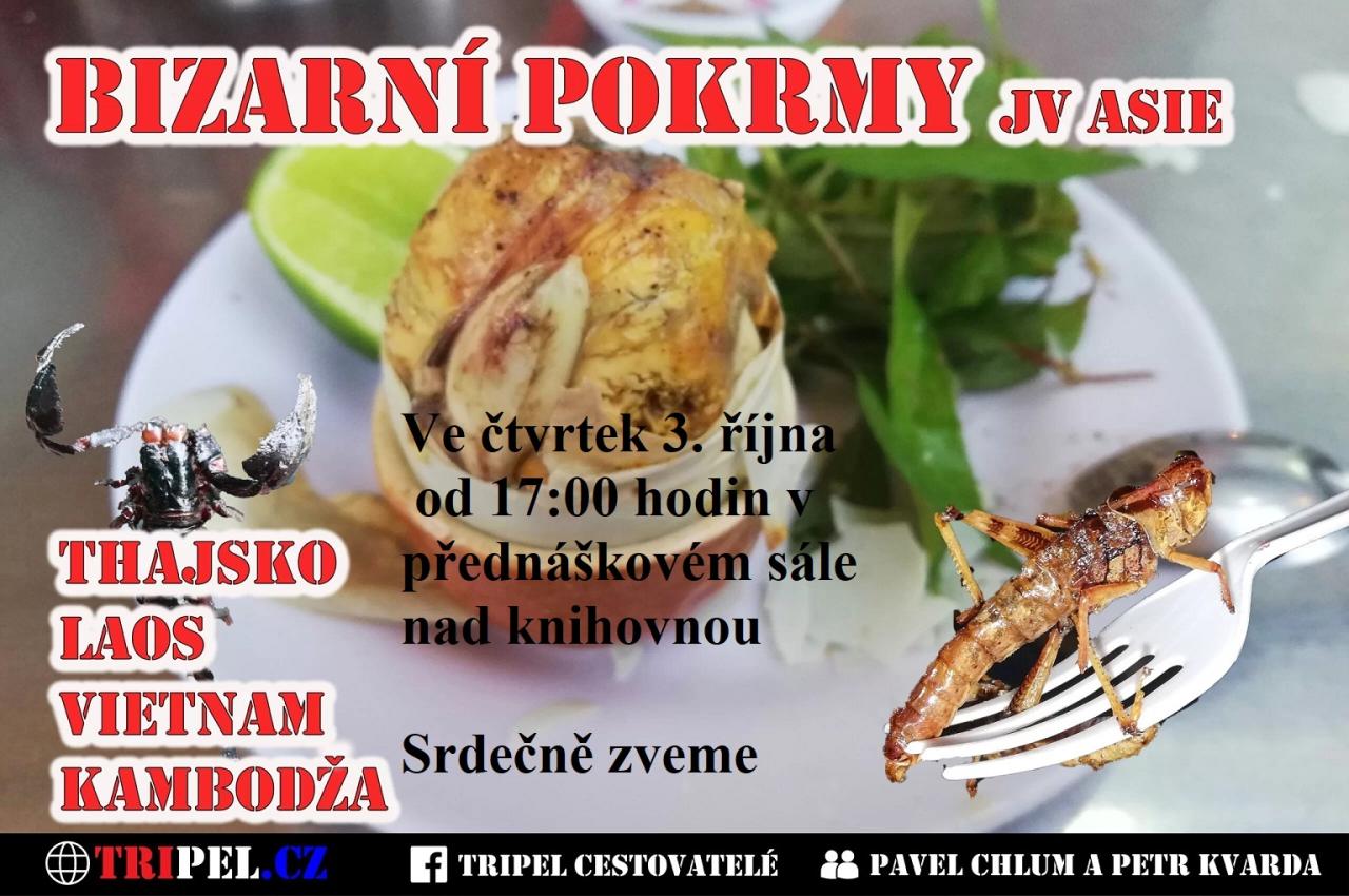 Ve čtvrtek 3.10. od 17:00 hodin nás čeká další cestopisná přednáška, tentokrát i s exotickou ochutnávkou! Nenechte si ujít poutavé vyprávění cestovatelů Pavla Chluma a Petra Kvardy, kteří nám představí neobvyklé asijské pokrmy.