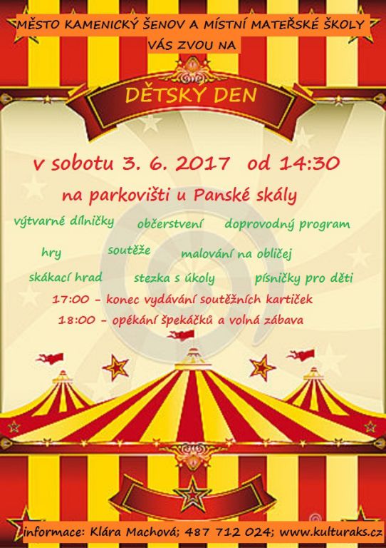 Přijďte s námi oslavit DEN DĚTÍ. V Kamenickém Šenově je naplánován na sobotu 3.6. Letos bude laděn do cirkusového stylu a začínat budeme v 14:30 na parkovišti u Panské skály. S dětmi se můžete těšit na výtvarné dílničky, hry a soutěže, skákací hrad a mnoho dalšího. V 17 hodin je ukončení vydávání soutěžních kartiček a od 18 hodin se budou opékat Špekáčky.