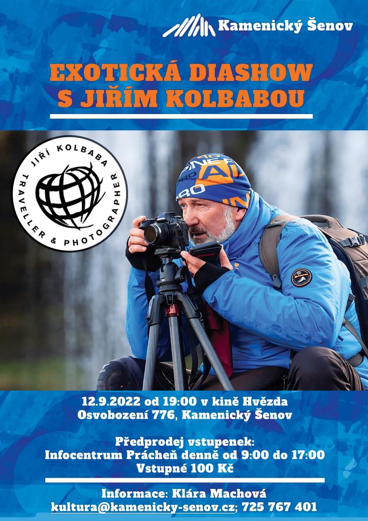 Známý český cestovatel Jirka Kolbaba, zavítá do šenovského kina Hvězda se svým cestovatelským pořadem. K vidění budou jeho krásné fotografie, k poslechu neuvěřitelné historky z celého světa a v průběhu večera si budete moci také zasoutěžit o zajímavé ceny.