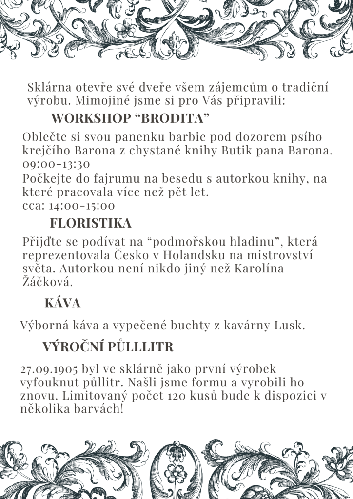 - Beseda s autorkou knihy "Butik pana Barona" - Marií Mrňávkovou od 14:00-15:00 (po fajrumu: konec sklářské směny).
