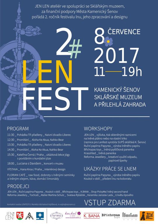 Akce LENFEST, která se zde uskuteční, se totiž nevěnuje sklu, ale rostlinnému materiálu LNU. Setkáme se zde se lnem jako se surovinou pro výrobu ručního papíru, samozřejmě přijedou výrobci textilu a nebude chybět ani lněné občerstvení. Představí se několik místních zpracovatelů (JEN LEN, Břichopas toys a Martina Schulz), ale svou tvorbu přivezou také designéři z Liberce, z Prahy nebo Ústí nad Labem. Pro nejmenší návštěvníky bude připraveno hned několik tvůrčích dílniček (výšivka, tisk na plátno, ruční papír, výroba hračky nebo šperku) a pohádka "Tři přadleny". Den v muzeu zakončí koncert Luciany Tomášové.