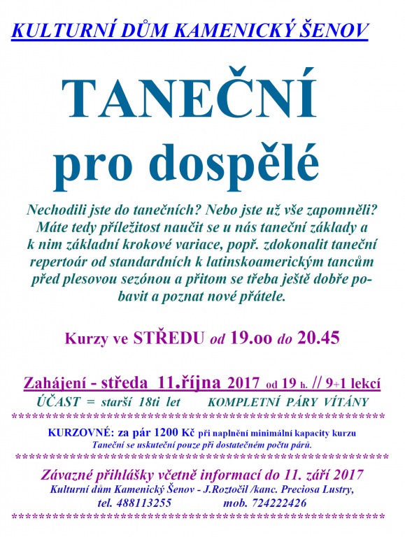 Kulturní dům Kamenický Šenov pořádá taneční kurzy od 11.10. 2017 v čase 19:00-20:45