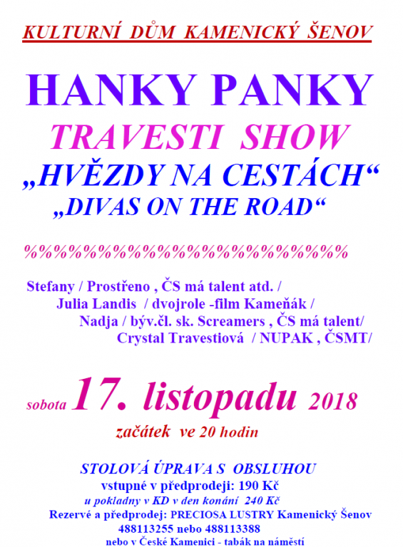 Kulturní dům Kamenický Šenov Vás srdečně zve na TRAVESTI SHOW "Hvězdy na cestách - Divas on the road" v podání Hanky Panky.